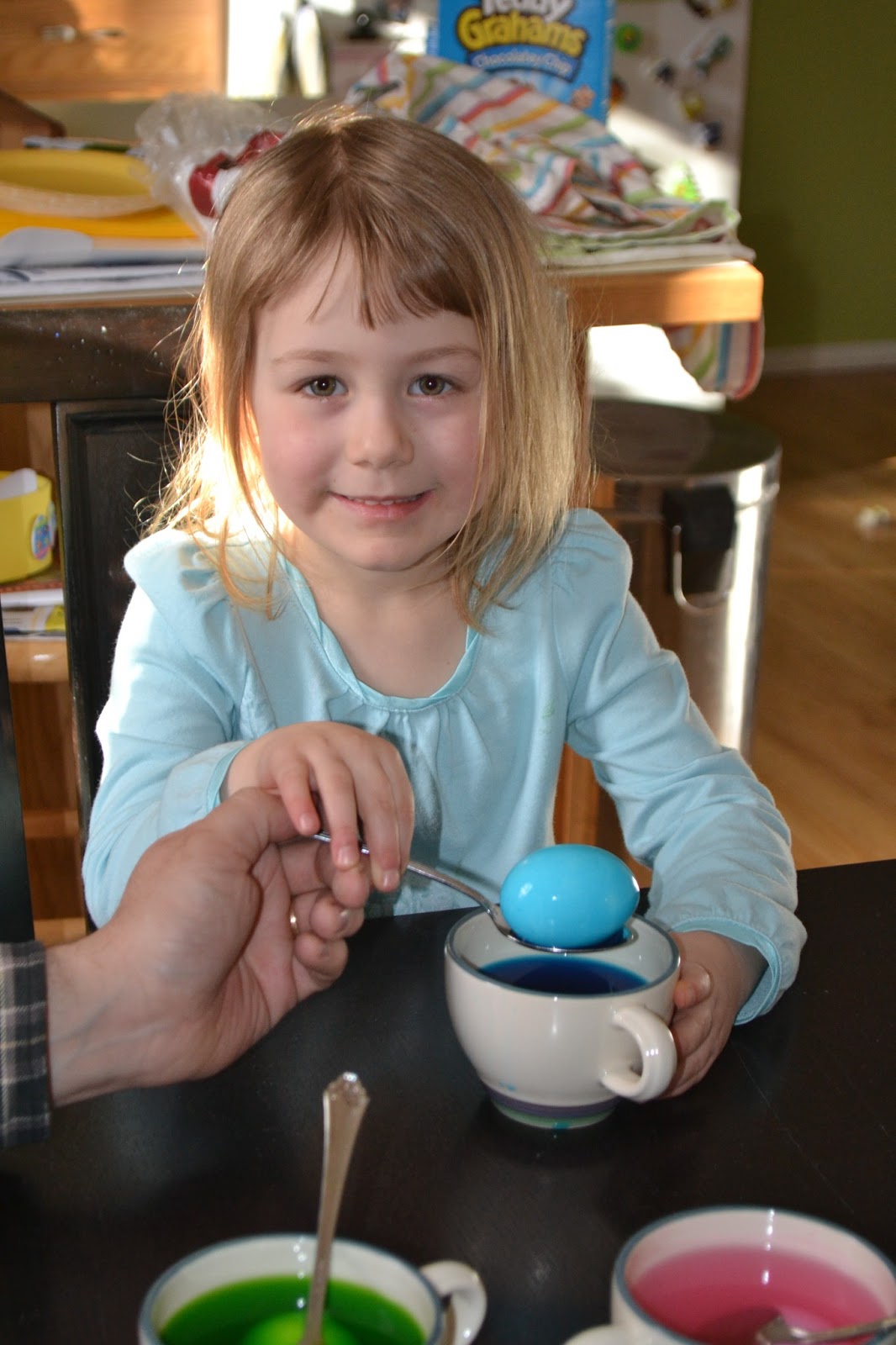 Over spring break, we had N2 dye Easter Eggs. They really enjoy it. Natalie likes to keep dying eggs after all the eggs have already been dyed so she redyes some of the eggs so that we have strange colored eggs. We tried coloring on the eggs with a wax crayon that came with the kit but they didn't press hard enough for the most part and it didn't show up. I think there may be one egg where they pressed hard enough.